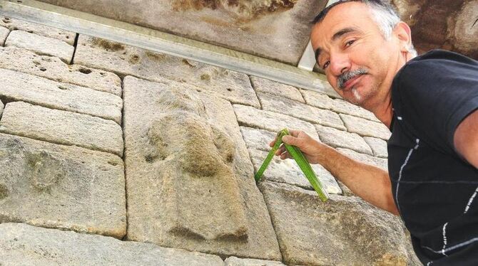 Steinmetz Klaus Locher repariert Risse und auseinanderdriftende Fugen an der Belsener Kapelle.