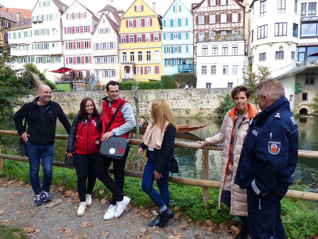 Einsatzort Platanenallee: Die Umweltscouts Eva Wiegert und Markus Mattauch im Gespräch mit Bürgermeisterin Daniela Harsch. Links Agentur-Geschäftsführer Stefan Degreif, rechts Miriam Ibrahimovic, Leiterin der Kommunalen Servicebetriebe Tübingen und Ralph Karau von der Fachabteilung Kommunaler Ordnungs- und Vollzugsdienst. FOTO: WEBER