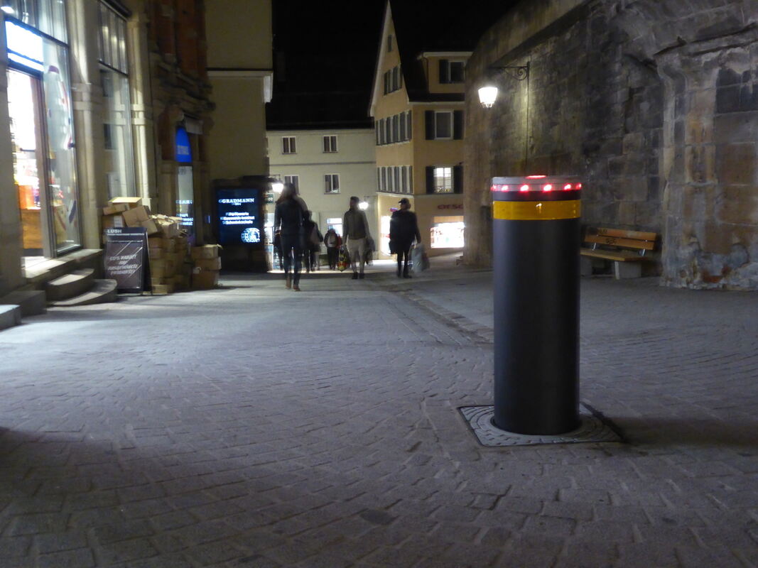 Versenkbarer Poller neben der Stiftskirchenmauer in der Neckargasse, der Fahrzeugverkehr zu den falschen Zeiten in der Tübinger Altstadt verhindern soll. FOTO: LENSCHOW
