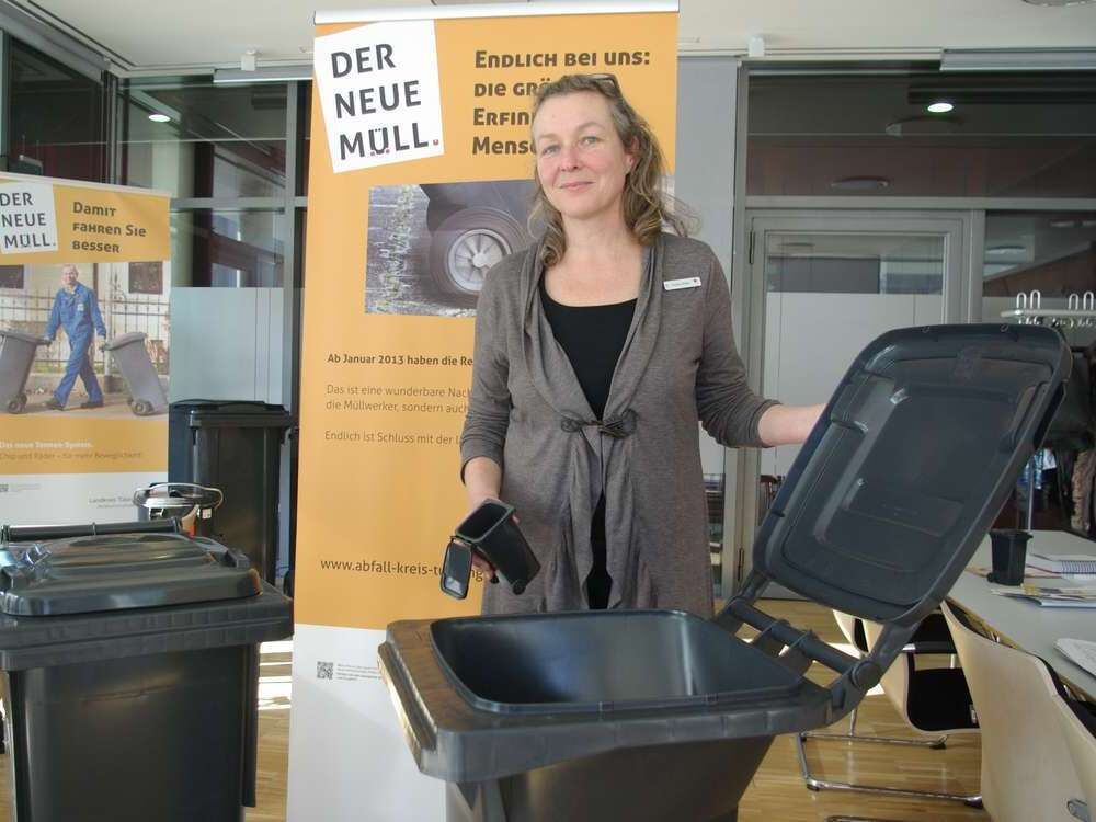Die Herrin der Tonnen: Sibylle Kiefer, Leiterin des Abfallwirtschaftsbetriebs, mit Behältern und Plakaten.