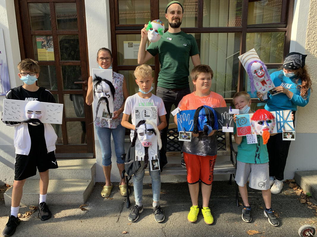 Theatermasken kunstvoll auf der Leinwand drapiert: Werke aus einem der Workshops im Künstlerdorf Kirchentellinsfurt.