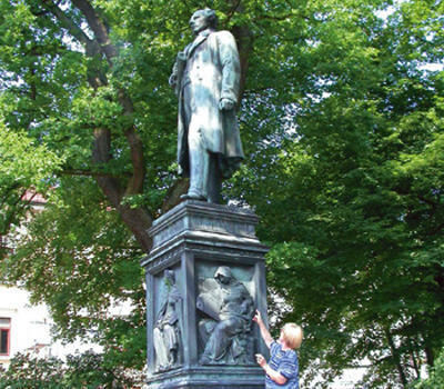 Wer steht so einsam auf dem Sockel? Wer es wissen will, muss die Tafel auf der Rückseite lesen: Ludwig Uhland, aufgestellt 1873.
