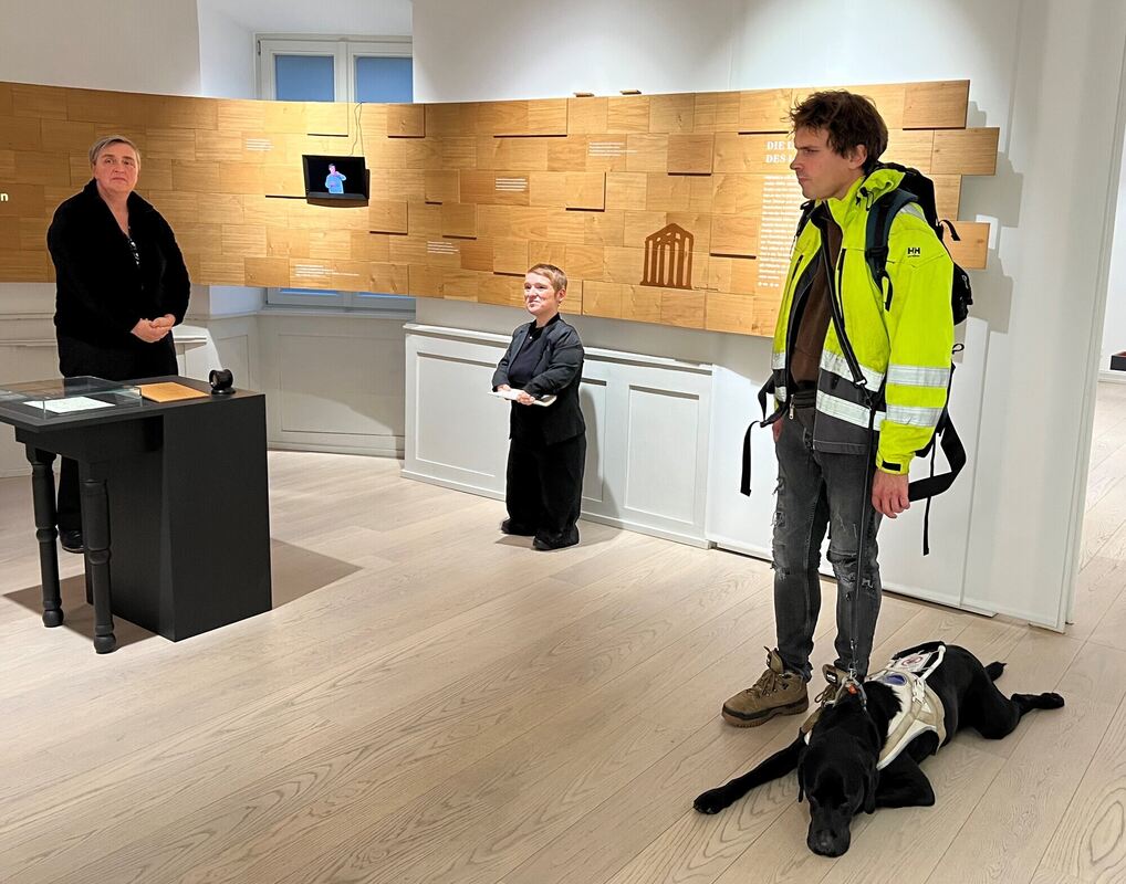 Die Leiterin der Tübinger Museen Wiebke Ratzeburg (von links), die Landesbehindertenbeauftragte Simone Fischer und Jakob Hermann, der die Barrierefreiheit der Internetseite geprüft hat, mit seinem Blindenhund. FOTO: STRAUB