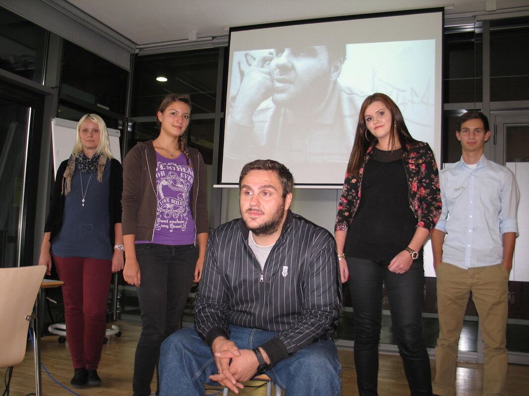 Rapper Ari Chicago (Mitte) und (von links) die Azubis Valerie Bauer, Alexandra Thiele, Angela Hüttinger und Robin Baur wollen junge Menschen erreichen. GEA-FOTO: KAE