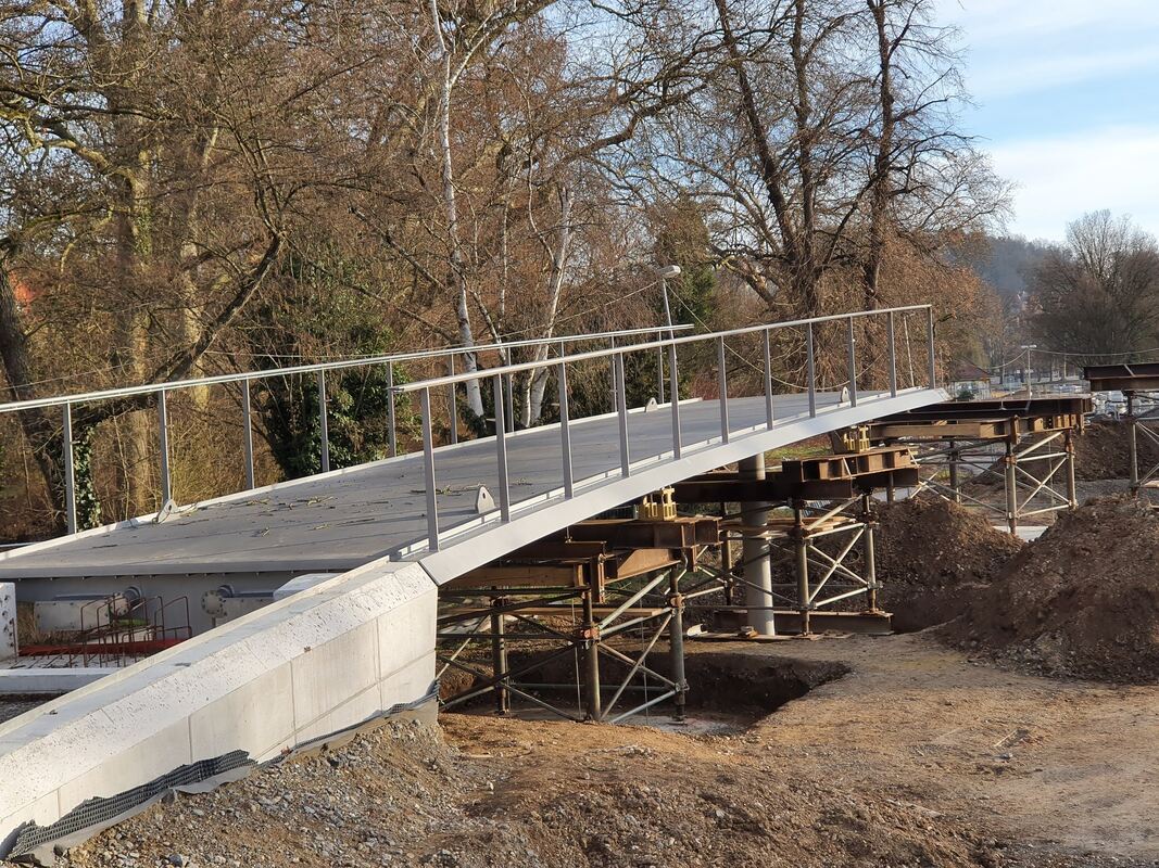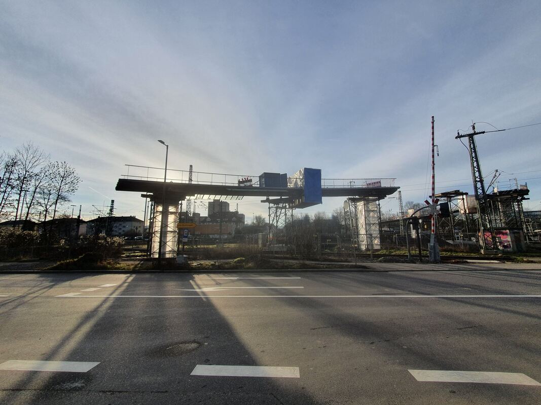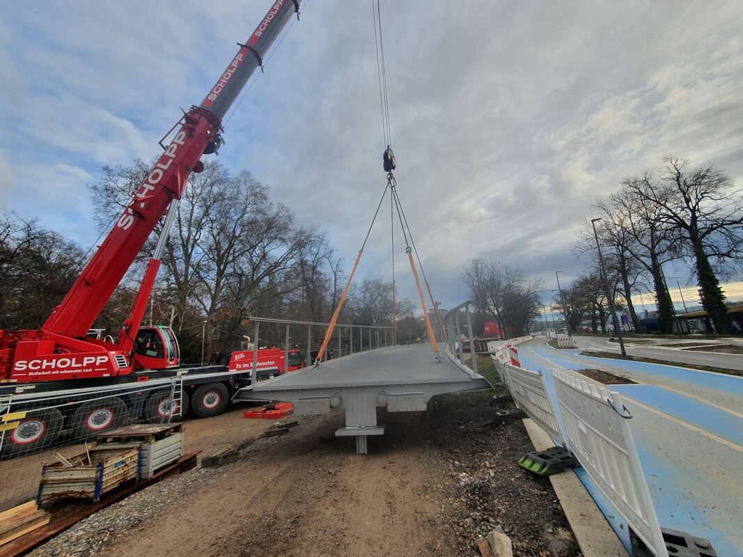 Es ist das neunte von insgesamt 15 Montageelementen. Das Brückenelement grenzt an das Brückenwiderlager im Anlagenpark. Es ist etwa 17 Meter lang und 33 Tonnen schwer. Das zehnte Element wird Anfang März eingehoben. Mit diesem wird die Lücke zwischen den Bahngleisen geschlossen.