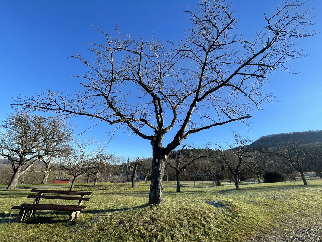 An der Zufahrt zum Schützenhaus steht der Patenbaum für den verstorbenen Tomy Fanore Wenzel. Rechts dahinter der Baum seiner Witwe – der 200ste Patenbaum des Netzwerks Streuobst.