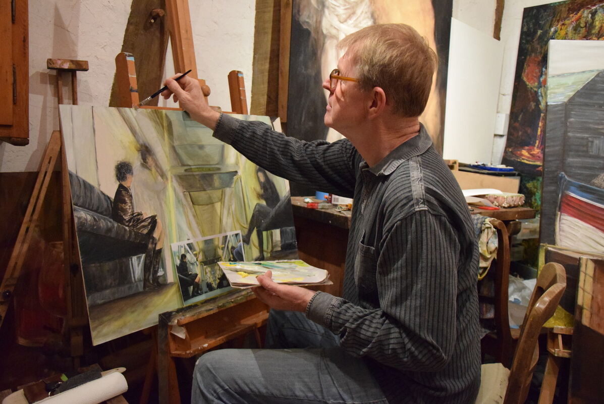 Paul Starrach, einziger Mann in der Malgruppe von Frank Köhler, malt eine vorab fotografierte Szene in einer Berliner U-Bahn. FOTO: STÖHR