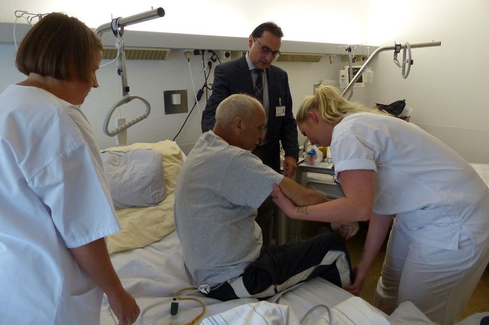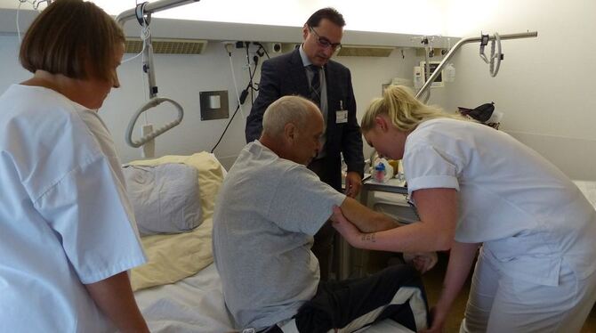 Elena Mirovic, Auszubildende im zweiten Lehrjahr, hilft dem Patienten Peter Lutz beim Aufrichten. Praxisanleiterin Katja Keppler und Pflegedirektor Klaus Tischler beobachten sie dabei. FOTO: WEBER