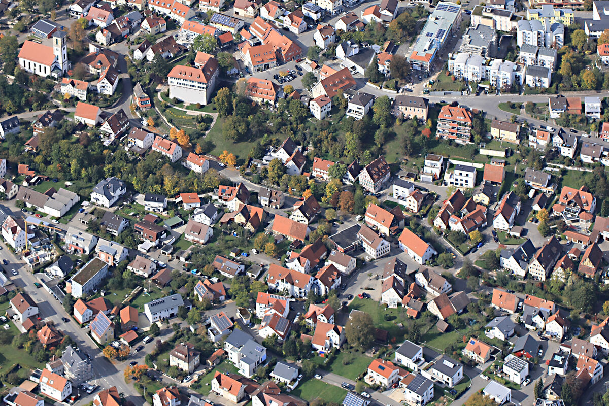 Halb historisch, halb betonmodern: Das Nachdenken über die Zukunft des alten Gomaringer Rathauses (Bildmitte) soll zum Nachdenken über die Gemeinde führen. FOTO: GROHE