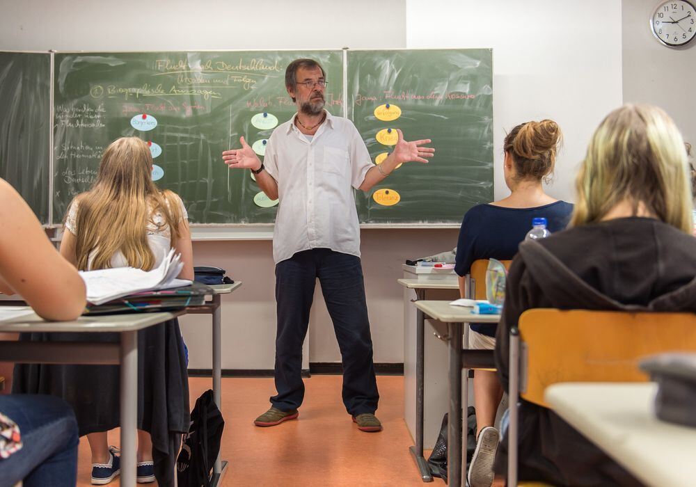 Lehrer Wolfgang Pasche im Rottenburger im Eugen-Bolz-Gymnasium in einem Klassenzimmer. Er behandelt mit seinen Schülern aus der zehnten Klasse das Thema Krieg und Flucht im Unterrichtsfach Gemeinschaftskunde.