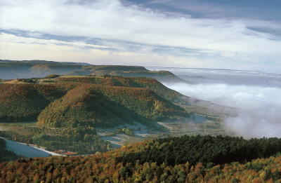 Blick entlang des Albtraufs mit Filsenberg (vorne), Farrenberg (Bildmitte) und im Hintergrund dem Dreifürstenstein.