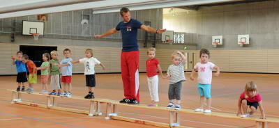 Andreas Ott und seine Wiesel: Spielerisch sollen die Kleinen in der Kindersportschule eine fundierte und umfassende Bewegungsausbildung erhalten.