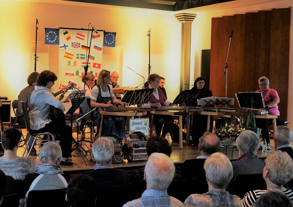 Stubenmusik mit dem Ensemble Saiten-Klang in Ofterdingen zum zehnjährigen Geburtstag der Zehntscheuer: 200 Zuhörer in vollen Stuhlreihen sind beim Konzert dabei. FOTO: STRAUB