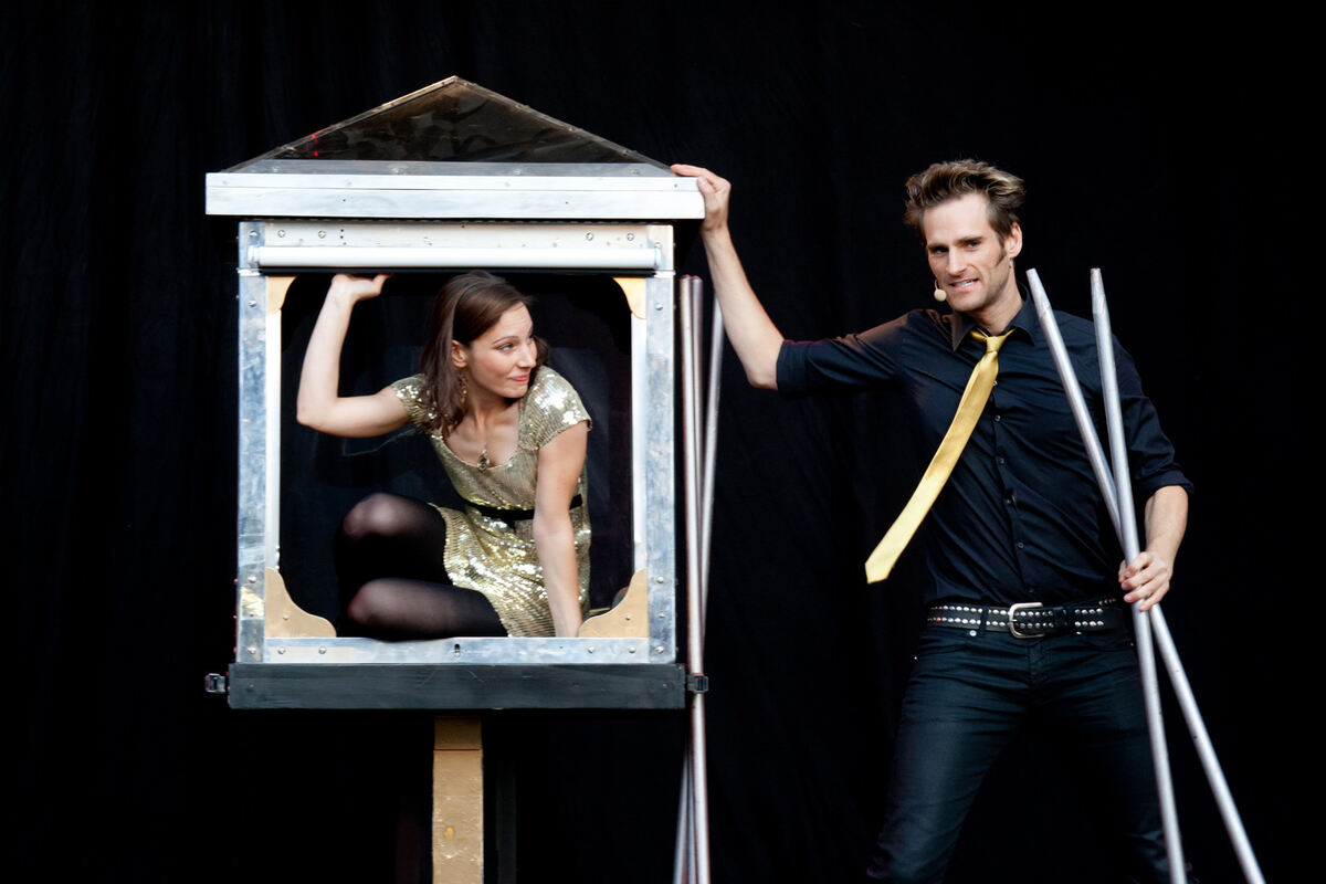 Mal lässt er die Bühnen-Partnerin verschwinden und woanders wieder auftauchen, mal geht er durch sie hundurch, als ob sie aus Luft wäre: Julius Frack mit Cindy bei einer seiner früheren Shows in Tübingen.