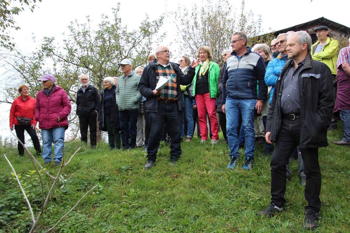 Über 40 Menschen haben die historische Ortsführung am Wochenende in Öschingen besucht. Ortshistoriker Hans Martin Schneider klärt hier die Gruppe über den Höllgraben auf, der oberhalb der Metzgerei Grießhaber noch im Ansatz zu erkennen ist und früher Wasser geführt hat.