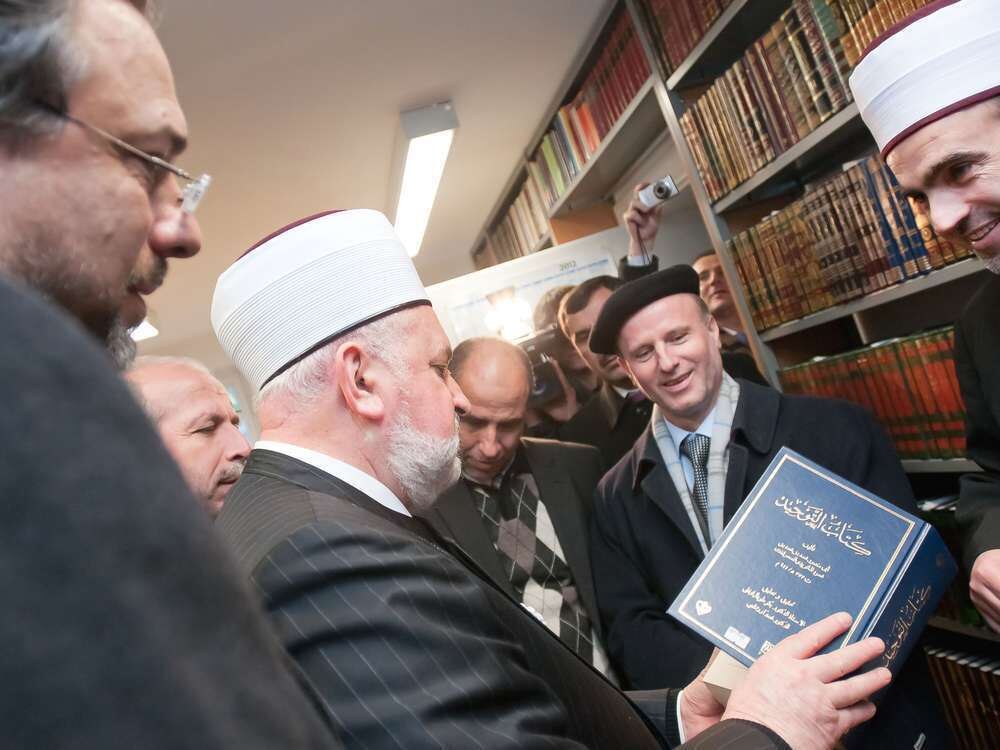 In der Bibliothek: Großmufti Mustafa Ceri hält eines der 3 000 Bücher in der Hand, die Instituts-Leiter Omar Hamdan (rechts neben ihm, den Kopf geneigt) dem Tübinger Zentrum zur Verfügung gestellt hat.