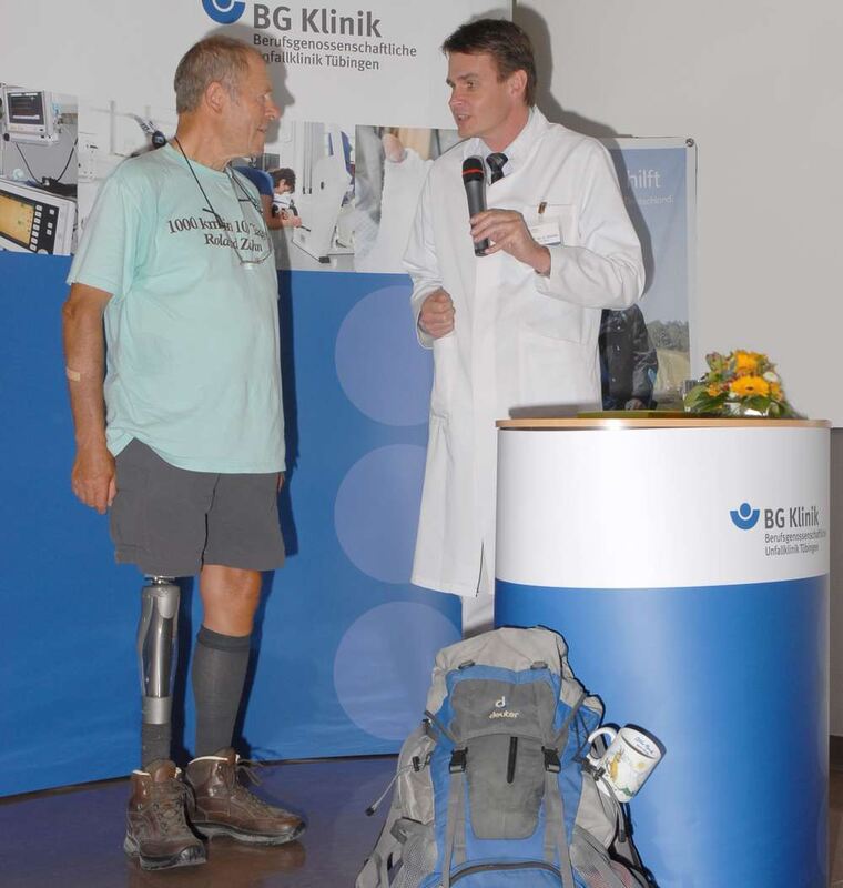 Geschafft. Roland Zahn mit Beinprotese am Ziel, rechts Professor Ulrich Stöckle. FOTO: UK