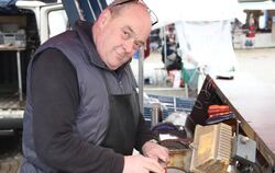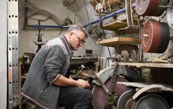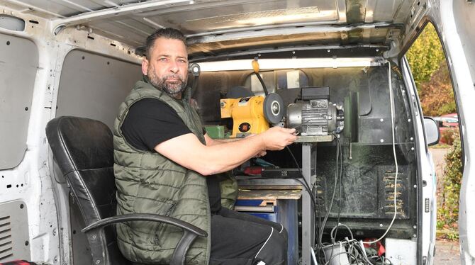 Schleifscheiben, Lamellenscheiben, Polierscheiben sowie laut Romeo Weiß »das gewisse Fingerspitzengefühl«. Selbstverständlich auch Gespür für die Bedürfnisse einer Laufkundschaft im Wortsinn. Die darf im Gegensatz zu anderen Anbietern gerne auf ihre frisch geschärften Arbeitsgeräte warten, womit dann neben Messer oder Besteck auch Gartenwerkzeuge wie Heckenscheren oder die Blätter von Rasenmähern gemeint sind. Je nach Aufwand dauert so eine Behandlung »zwischen fünf und sieben Minuten«. Der Lohn dafür bewegt sich im Bereich des Gegenwertes von zwei Pappbechern Kaffee. Es gebe überall Stammkunden. Menschen, die über die Telefonnummer 0176 7734 1001 nachfragen, wann der mobile Schleifservice wo zu finden ist, um vorbeizuschauen. Bei älteren Menschen oder Betrieben fahren Weiß & Söhne auch gerne vorbei. »Es machen ja nicht mehr viele den Beruf«, sagt Romeo Weiß, »das Geschäft wird wegen der Wegwerfgesellschaft weniger.«