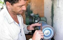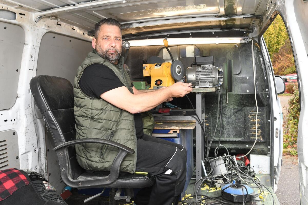 Alteingesessene Handwerker und das Weiß-Trio unterscheiden sich in ihrem Auftritt deutlich. Hier beachtliche Räumlichkeiten, dort ein weißer Kastenwagen. »Wir sind fahrendes Volk«, sagt Romeo Weiß stolz. Wenn er in seine Werkstatt will, braucht er nur die Schiebetür des Wagens zu öffnen, das mobile Stromaggregat anzuwerfen – und los geht’s wie jetzt vor dem Haupteingang des Real. Wochentags von 10 Uhr bis 16 Uhr, samstags wird eine Stunde früher Feierabend gemacht. Die Arbeitsmittel der Familie Weiß unterscheiden sich wenig von denen ortsfester Scherenschleifer.