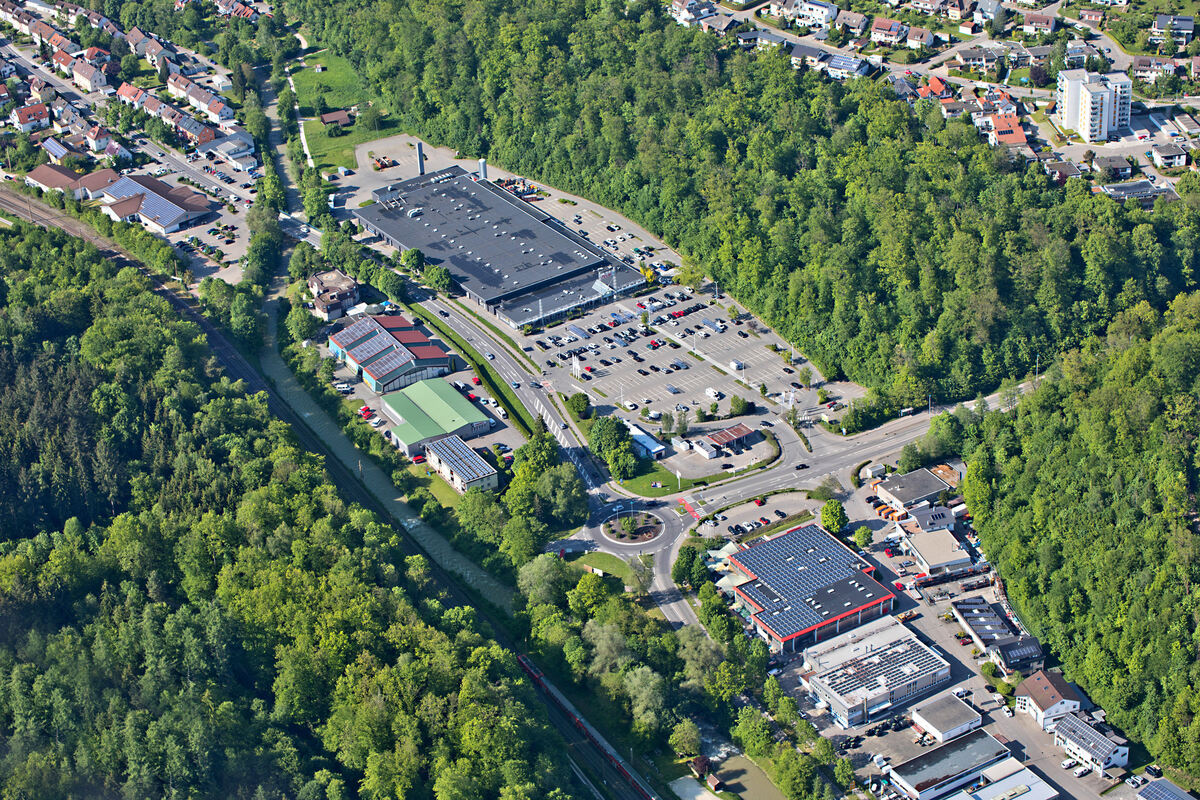 »Die größte Verkaufsfläche pro Einwohner in der gesamten Region Neckar-Alb«. Der Regionalverband kritisiert die Handelsflächen in der Wannweiler Straße. Unten rechts der Sonderpostenmarkt Thomas Philipps, in der Bildmitte Real und links der Echaz Aldi, dessen Pläne den Streit ausgelöst haben. FOTO: GROHE