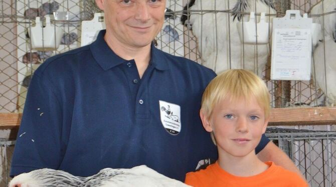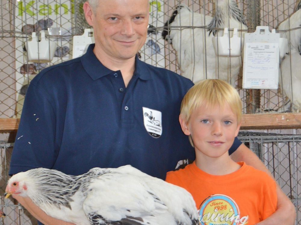 Vorsitzender Jürgen Bäßler mit Arne Beckmann, einer von sieben Jugendlichen im Verein. Während Bäßler Brahmas züchtet, ist Beckmann auf Zwerghühner spezialisiert. FOTO: VEY