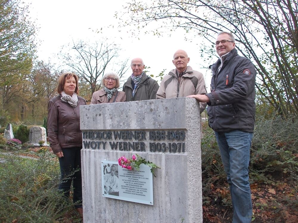 Annerose Braun, Hiltraut und Tilman Wohlgemuth, Norbert Poreski und Günter Brucklacher am Grabstein des Künstlerehepaars.