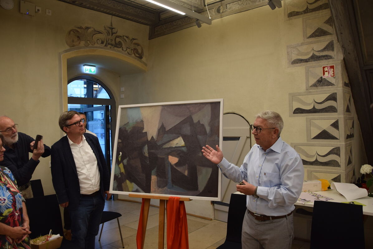 Das ist ja gar keine leere Leinwand mit einem flotten Spruch, sondern ein Bild von Günter Hildebrand: Werner Rukaber (rechts) mit seinem Abschiedsgeschenk. FOTOS: KREIBICH