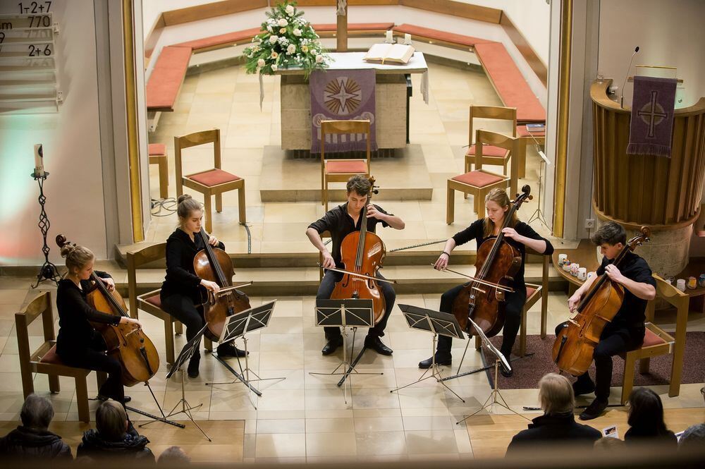 Zwölf Cellisten in der Kirche