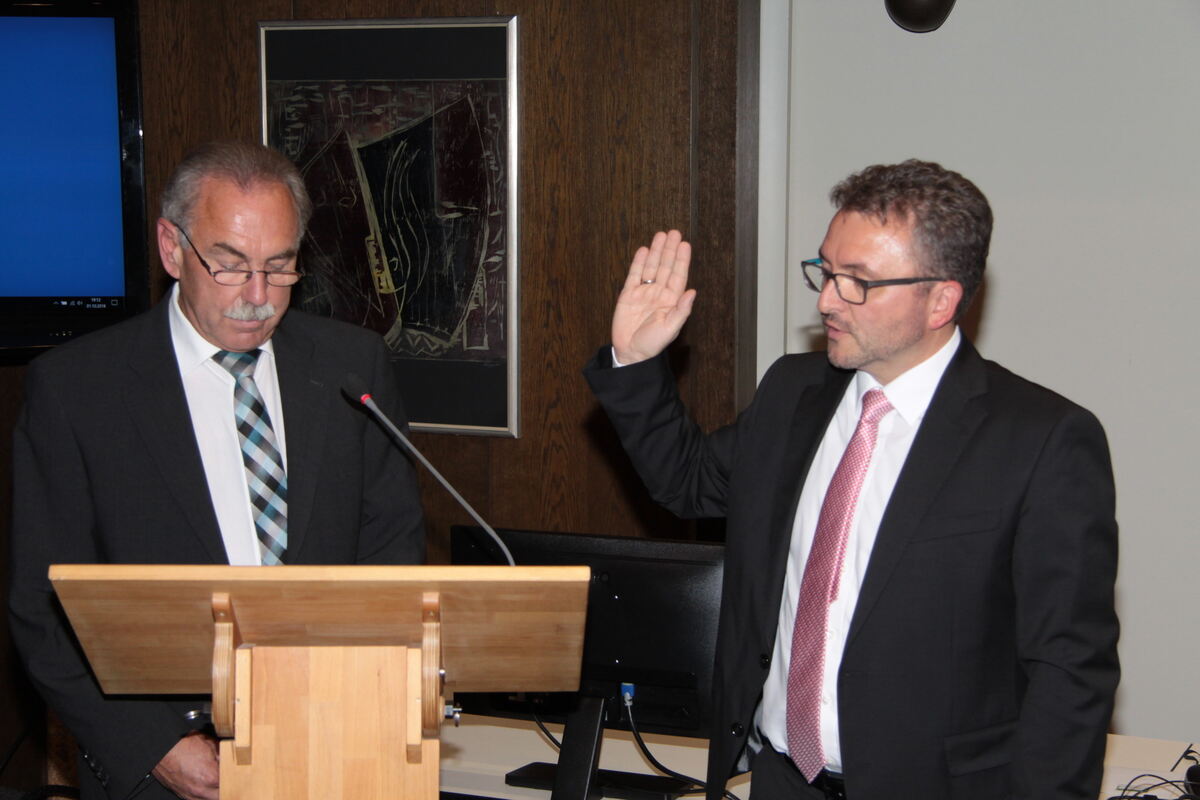 Michael Bulander (rechts) wid als OB für die zweite Amtszeit von seinem Stellvertreter Bernd Müller verpflichtet. FOTO: MERKLE