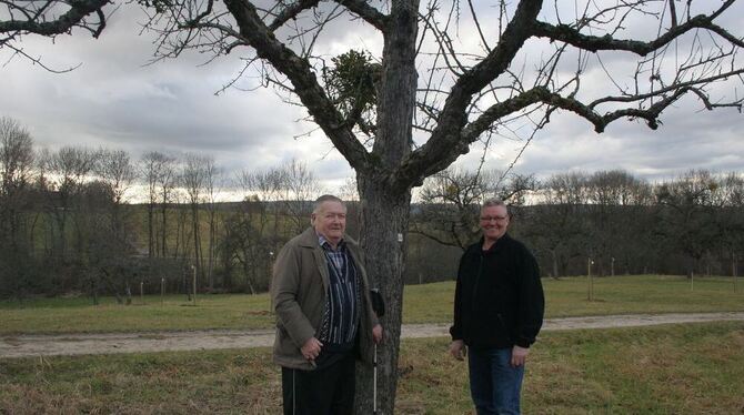 Georg Renz (links) hat 45 Jahre lang die Bäume im Gomaringer Buchbach gepflegt. Günter Letz, der Vorsitzende des Obst- und Gartenbauvereins, hat zusammen mit Bauhofmitarbeitern und Bürgermeister neue Bäume gepflanzt.
