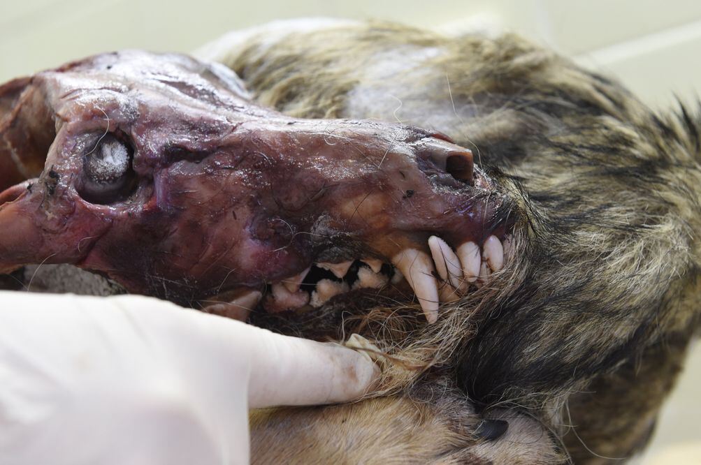 Der gefrorene Kadaver eines Wolfs wird am 7.9.2015 im Staatlichen Museum für Naturkunde in Karlsruhe gezeigt. Der Wolf wurde nahe der Autobahn 5 bei Lahr überfahren und wird nun in dem Museum bis Ende des Jahres für wissenschaftliche Zwecke fachmännisch präpariert. Foto: Uli Deck/dpa