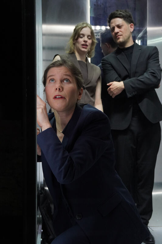 Szene aus »Die Sparmaßnahme« am Tübinger Zimmertheater mit Alina Valerie Weinert (vorn), Johanna Engel und Julian Lehr.