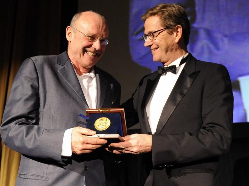 Guido Westerwelle (r) überreichte die Ehrung in New York an den Künstler Anselm Kiefer. Foto: Andrew Gombert