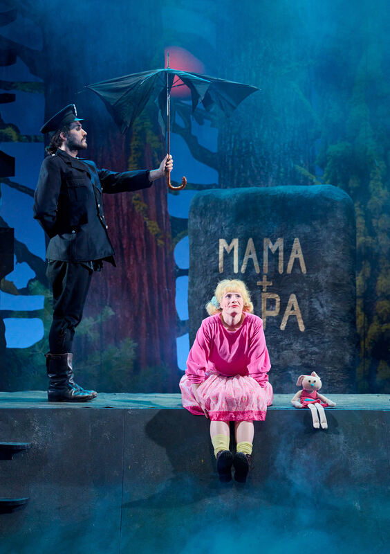 Tiffany (Clara Schulze-Wegener, hier mit Schauspielkollege Michael Mayer) muss in »Die drei Räuber« nach Tomi Ungerers Bilderbuch allein klarkommen. FOTO: SIGMUND/LTT