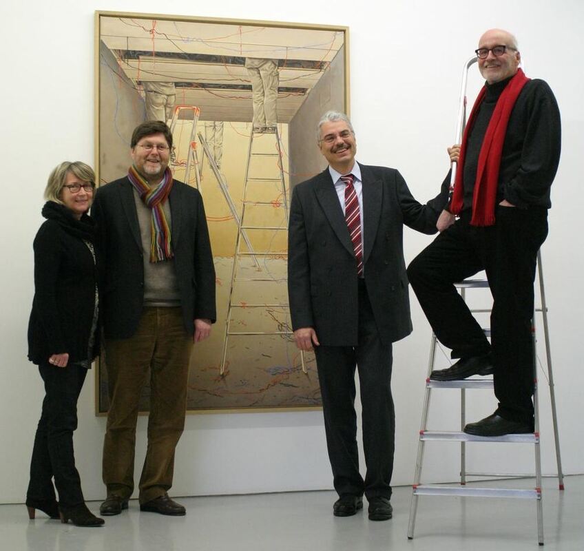 Gruppenbild beim Presserundgang: (von links) das Galeristen-Ehepaar Elisabeth und Wilfried Thron mit den Kuratoren Raimund Menges und Otto Rothfuss (auf der Leiter) vor einer Ölmalerei von Volker Blumkowski in der Ausstellung »Aufbruch« aus dem vierteiligen Ausstellungszyklus »Neuland«.