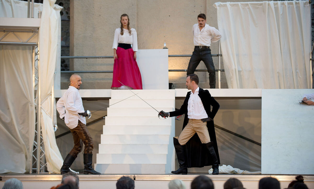 Robert Atzlinger gibt einen gleichermaßen selbstkritischen wie wortfechtend-gewitzten und verzweifelten Cyrano. Heiner Kock darf als Christian durch und durch Mann sein, mit allen Widersprüchen. Wolfgang Grindemann stellt als Le Bret dem innerlich blockierten Cyrano die richtigen Fragen, und Sebastian Hammer hat als Graf de Guiche wirklich starke Auftritte. Das Stück ist noch bis 5. August open air im Spitalhof zu sehen. (GEA)