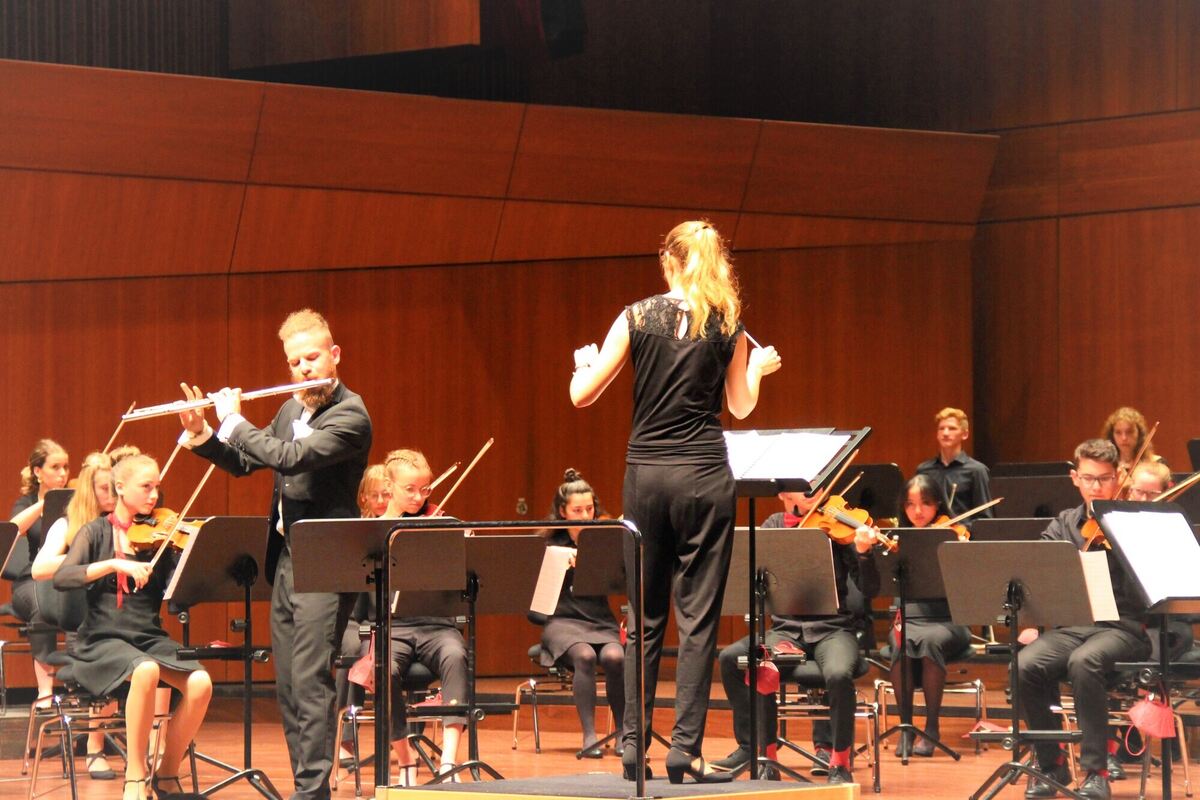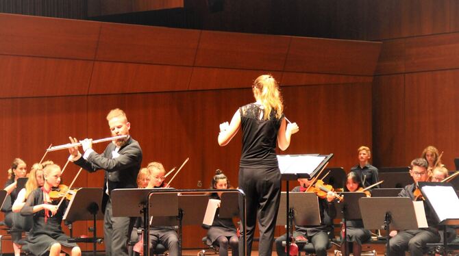 Das Nachwuchs-orchester spielte unter der Leitung von Maria Eiche Werke, bei denen nie alle Spieler zugleich beschäftigt waren. Lukas Dorfmüller zeigte sich mit seiner Querflöte als einfühlsamer Solist. FOTO: VARADY