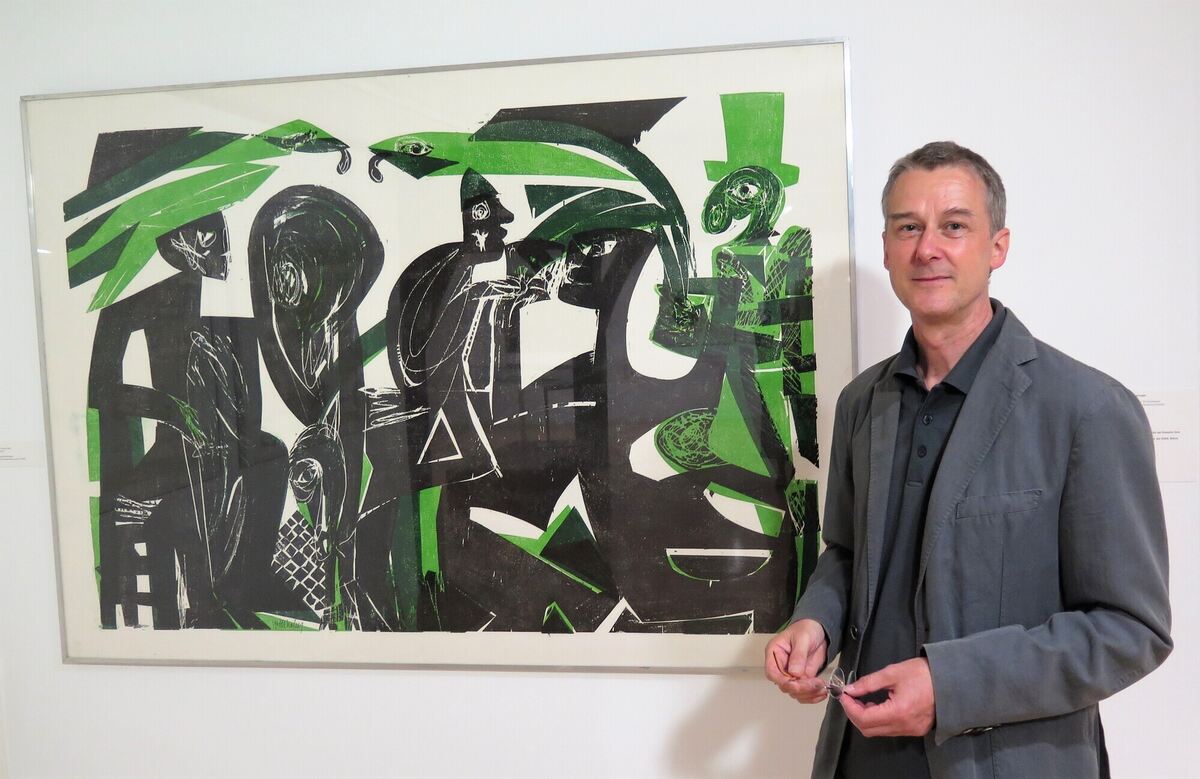 Ausstellungskurator Rainer Lawicki vor HAP Grieshabers Farbholzschnitt »Chout« (1962/1968). FOTO: STRÖHLE