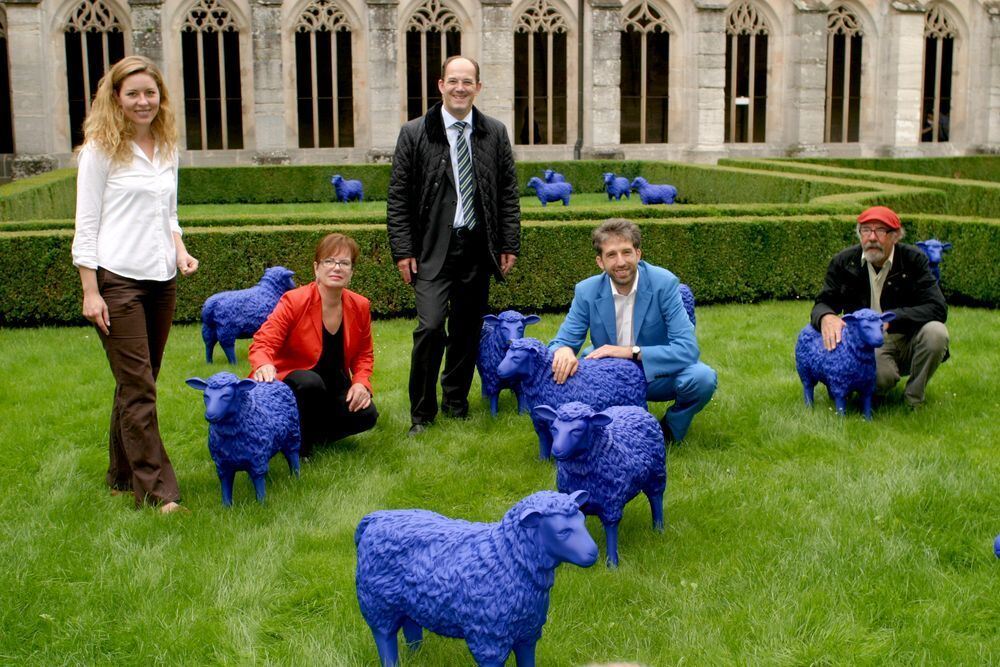 Die Blauschafherde im Kloster Bebenhausen, von links: Schlossverwalterin Janna Almeida, Bertamaria Reetz, Frank Krawczyk von der Landesschlösserverwaltung, OB Boris Palmer und Rainer Bonk.