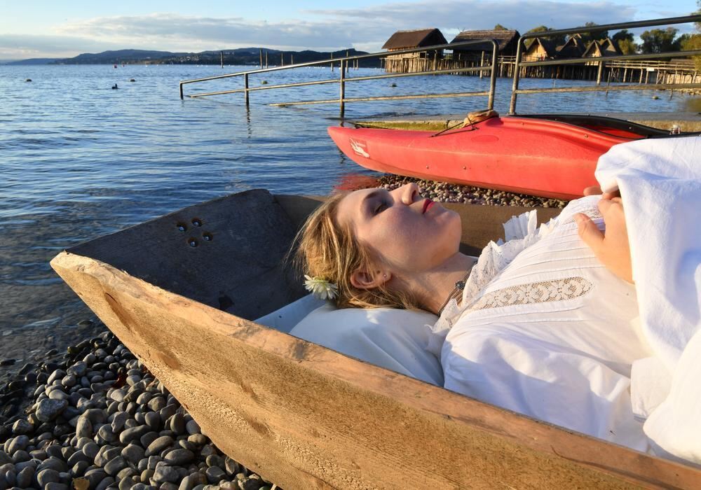 Schauspielerin Larissa von Kleist liegt beim Pfahlbaumuseum in Unteruhldingen am Bodensee für die Vorabendserie »Wapo Bodensee« in einem Holzkahn und spielt eine Tote.