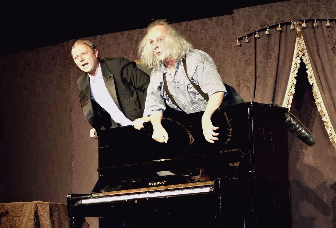 Auch so lässt sich ein Klavier virtuos bedienen. Gogol (links) und Mäx zeigten, wie es geht. Das Duo trat im Bonhoeffer- Gymnasium auf. FOTO: BÖHM