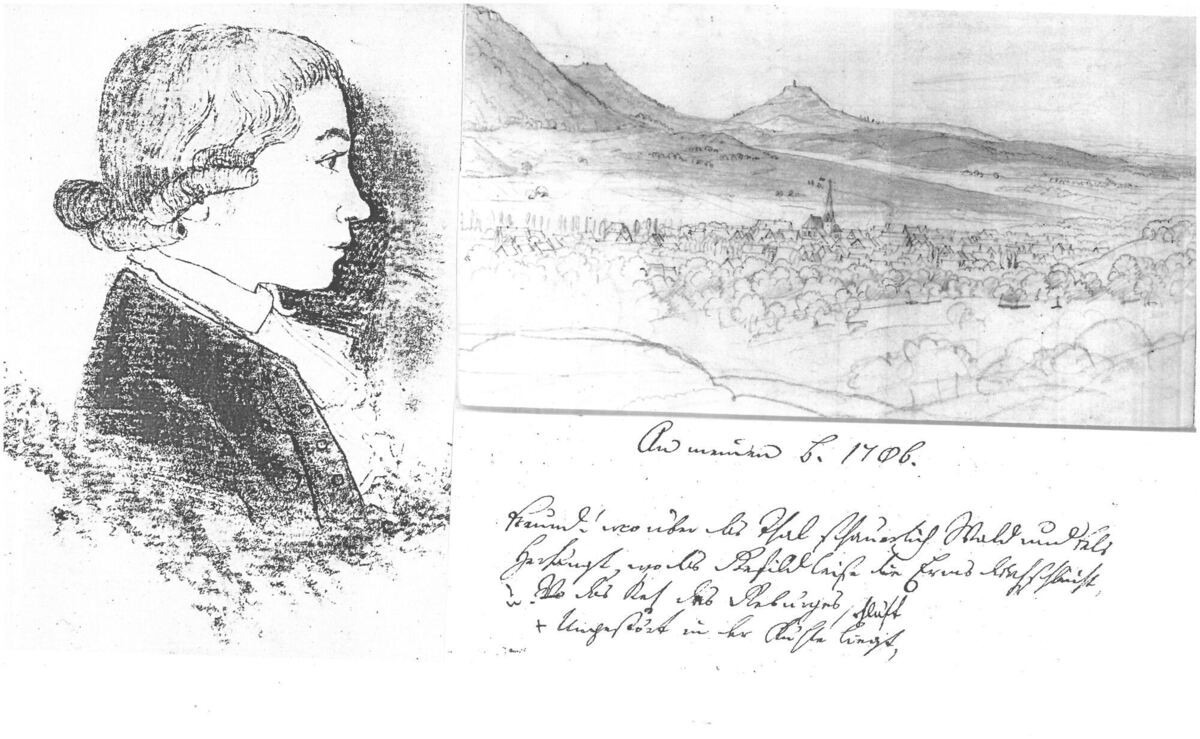 In der Wilhelm-Zimmermann-Gedenkstätte ausgestellte Bildmontage mit einem Hölderlin-Porträt, einer von Eberhard Emminger gezeichneten Ansicht Dettingens von 1855 und Hölderlins Ermstalgedicht in seiner eigenen Handschrift. FOTO: RANDECKER