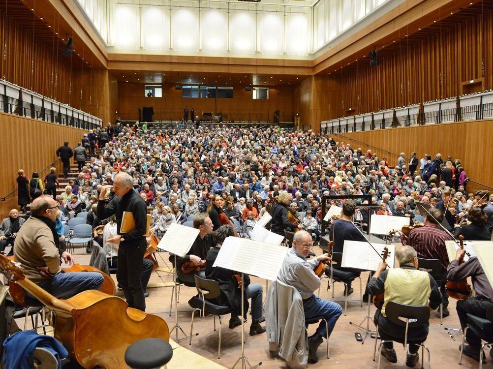 Noch schnell ein Erinnerungsfoto: Fagottist Michael Laucke hält bei der Akustikprobe den Blick in den neuen Saal fest. GEA-FOTO: PACHER