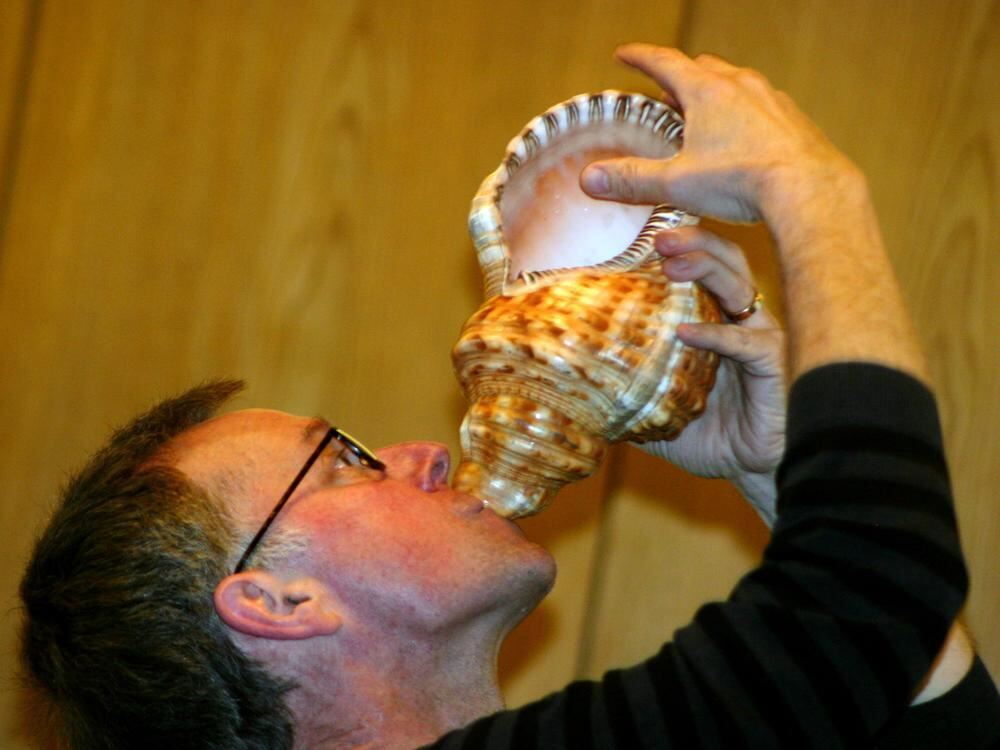 Mike Svoboda entlockt einer Südseemuschel röhrende Töne. FOTO: JÜSP