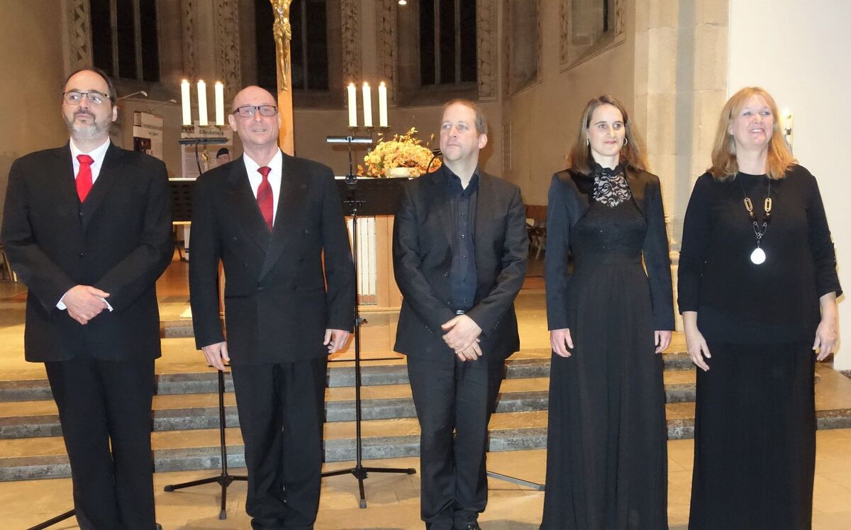 Von links: Sebastian Mory (Tenor), Dietrich Wrase (Bass), Organist Stephen Blaich, Mareike Weiffenbach (Alt) und Susan Eitrich (Sopran). FOTO: BÖHM