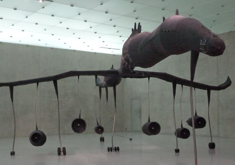 Faszinierend: Wael Shawkys schwarze Vogel-Drachen-Flugzeug-Skulptur mit Bomben-Anhang, geschaffen für Bregenz. FOTO: KUNZE