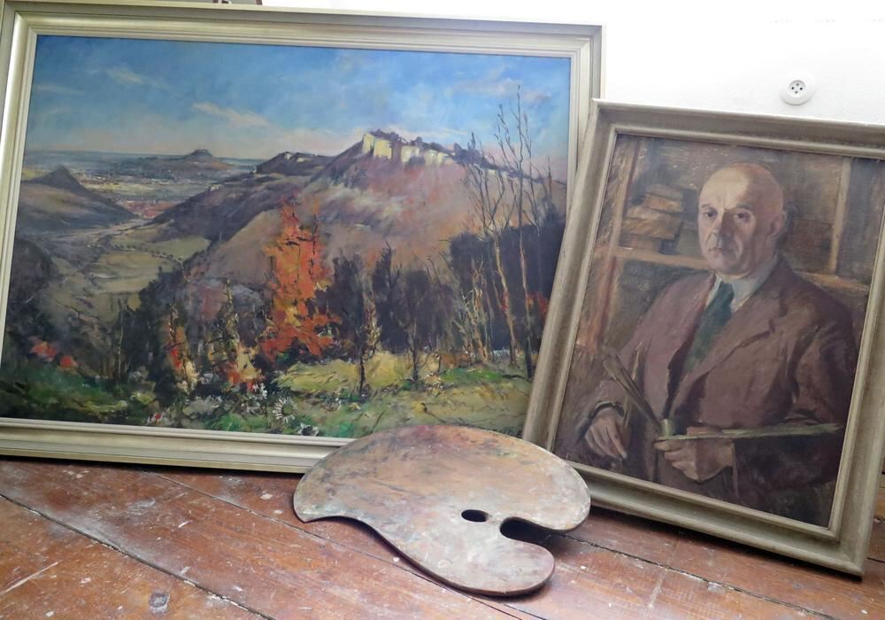 Rechts ein Selbstporträt Wilhelm Kehrers, links eines seiner letzten vollendeten Bilder mit Albtrauf und Achalm.