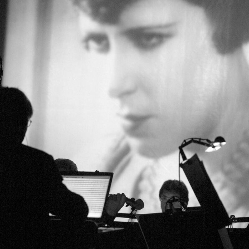 Farbige Musik zu rätselhaft fahlen Bildern: Szene aus Buñuels Film. Vorne dirigiert Friedemann Dähn vom Laptop aus die sekundengenau synchrone Vertonung.