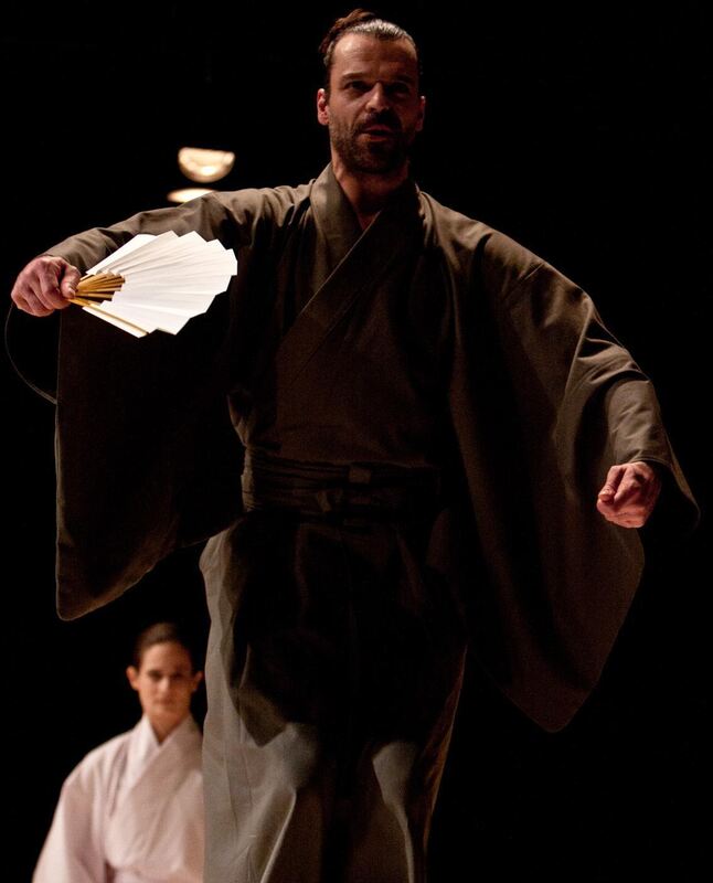 Kleist in fernöstlicher Ästhetik: Eric van der Zwaag als Achilles, hinten Galina Freund als Chorsprecherin. FOTO: TONNE/SCHULTZE