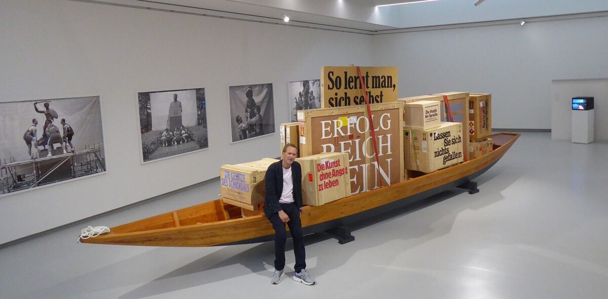 In der Kunsthalle Tübingen: Christian Jankowski mit Stocherkahn, in dem sich die Titel von Ratgeber-Literatur finden. FOTO: BERNKLAU